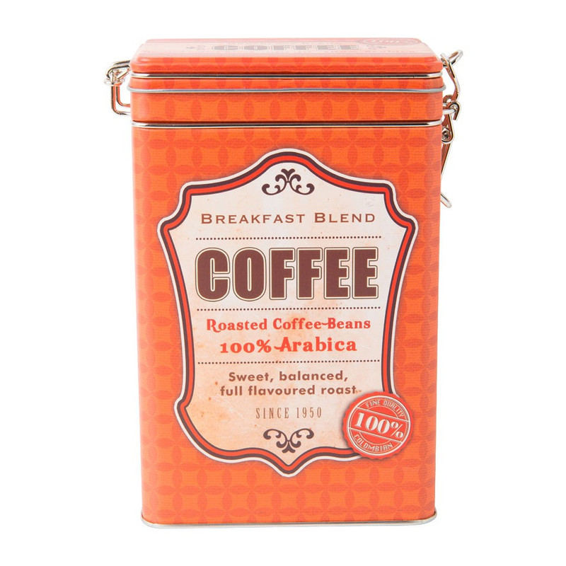 In dit blik met goed afsluitbare deksel bewaar je koffie op een leuke manier. Op het blik staat een retro opdruk in bruin met oranje kleuren. De afmeting is 7.5x12x19 cm en deze is gemaakt van staal. De clip zorgt ervoor dat je het blik super goed kunt afsluiten. Combineer met de andere blikken uit deze serie om er een mooi geheel van te maken. * Voorraadblik coffee
