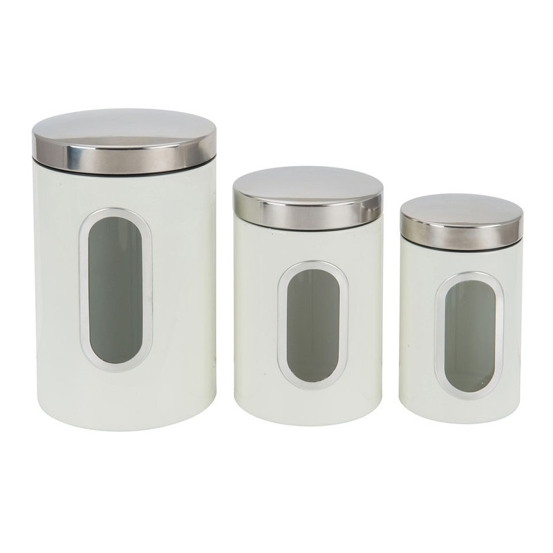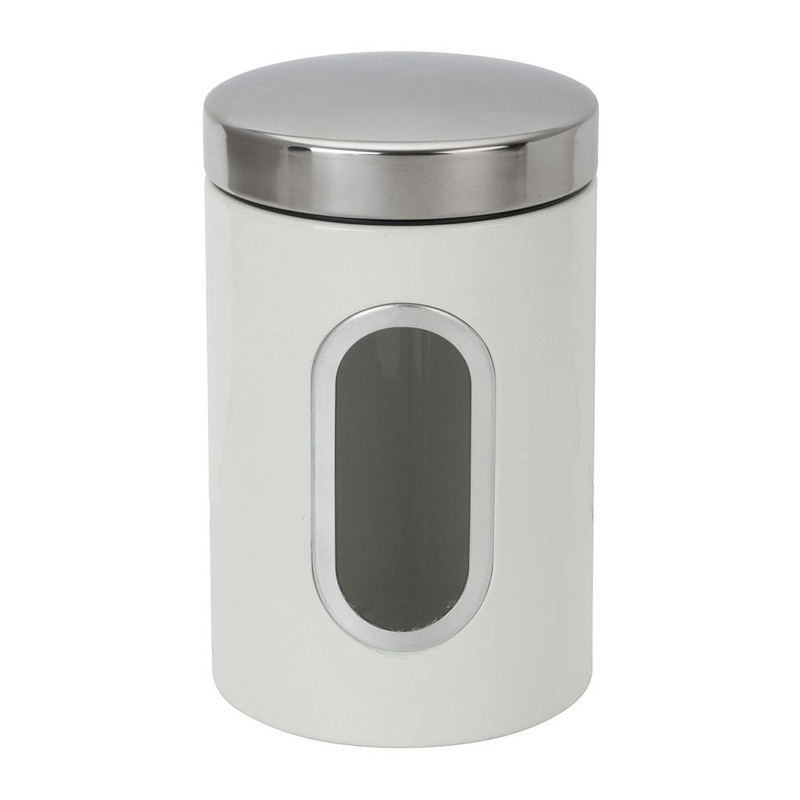 De blikken zijn gemaakt van metaal en beschikbaar in 3 verschillende formaten. Leuk om de verschillende formaten met elkaar te combineren. Het blik heeft een diameter van 11 cm en een hoogte van 17 cm. De voorraadpot is crèmekleurig en de deksel is zilverkleurig.