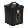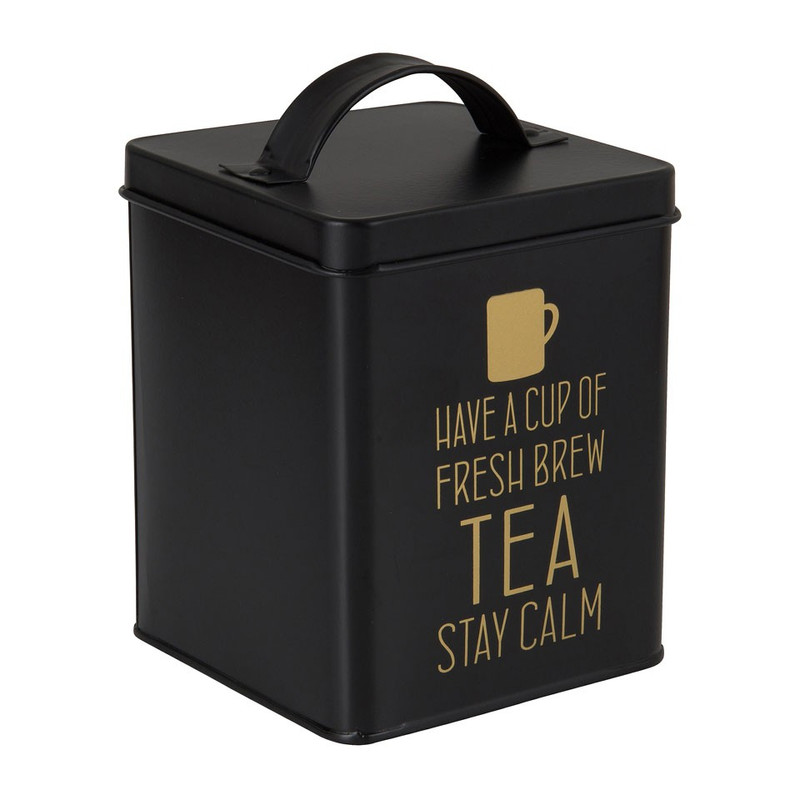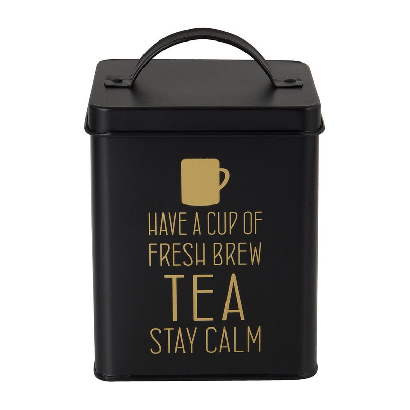Bewaar jouw favoriete theezakjes in dit zwarte blik met een leuke tekst als opdruk. Op het blik staat de tekst 'Have a cup of fresh brew tea stay calm'. De afmeting is 11x11x14 cm en deze is gemaakt van staal. Combineer met de andere blikken uit deze serie om er een mooi geheel van te maken.
