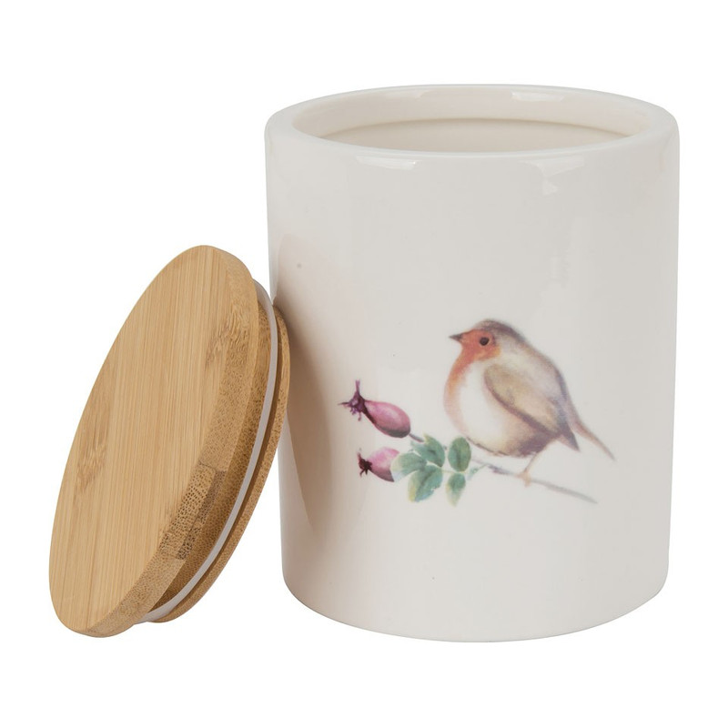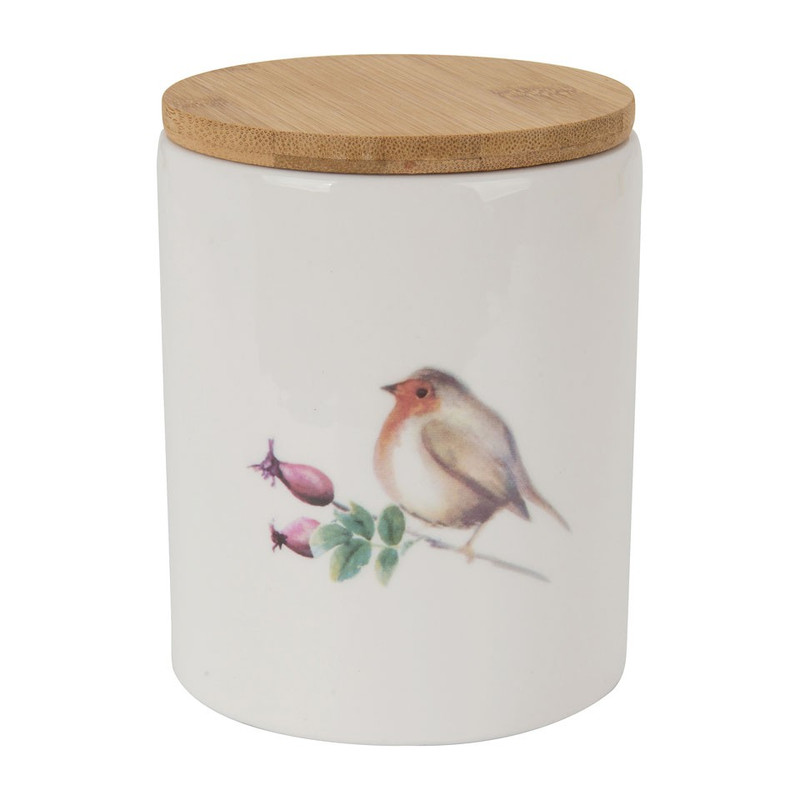 Leuke witte voorraadpot met je afbeelding van een roodborstje. Deze voorraadpot vraagt om een mooi plekje. Hij is handig in de keuken als opslagbus. En ook in de woon- speel- of studiekamer kun je er allerlei kleine spulletjes in opbergen. De voorraadpot is van keramiek gemaakt en heeft een mooie bamboe deksel. De hoogte van de pot is 13 cm, diameter is 10 cm. Combineer de leuke voorraadbus met andere artikelen van onze toffe serviezen.