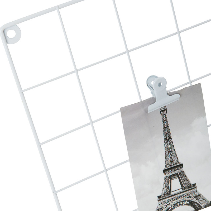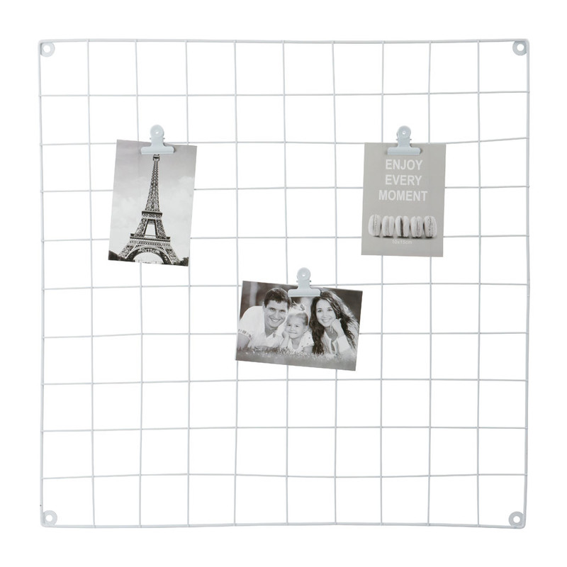 Hang to-do lijstjes, foto's of andere belangrijke dingen aan dit vierkante wandrekje. Het rekje is wit van kleur en heeft een afmeting van 60x60 cm. Er zitten 3 clips aan waar je briefjes of foto's aan kunt ophangen. Dit rekje is gemakkelijk met schroeven aan de muur te bevestigen.