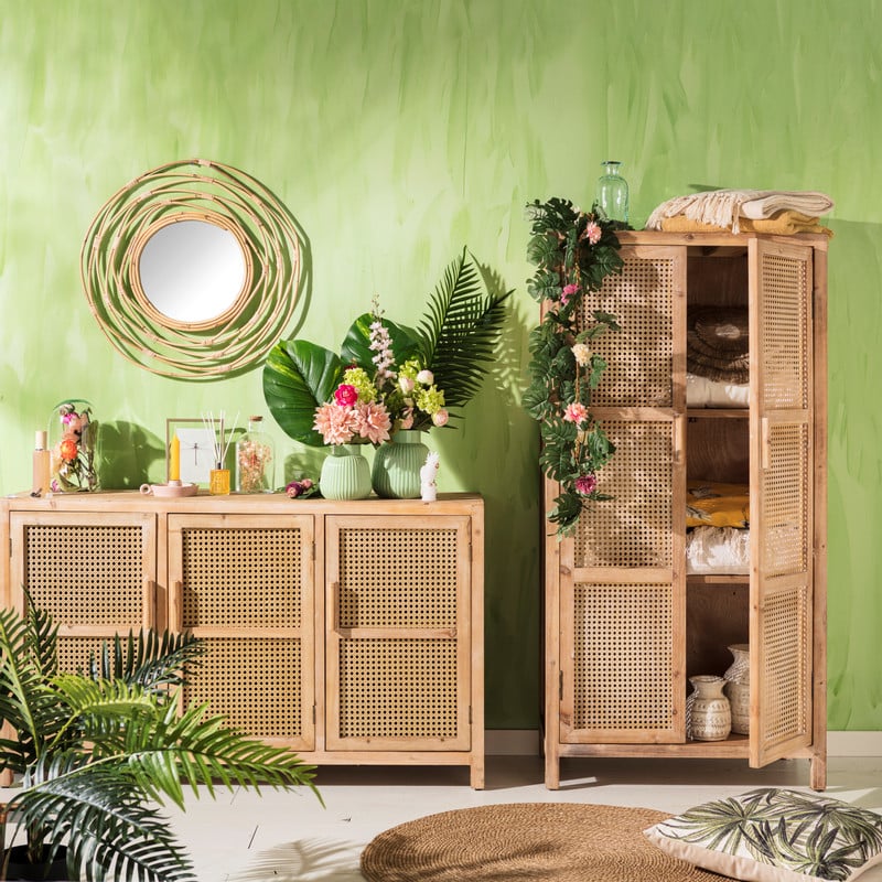 Het dressoir Bandung is gemaakt van hout en de deurtjes zijn gemaakt van webbing. Webbing is een speciale manier van het vlechten van rotan en bestaat al decennia. De trend is weer terug en we zien het dan ook voorbijkomen in ons hele interieur. Zo ook in dit Bandung dressoir. Het vlechtwerk heeft een bohemian en retro look en is dus helemaal van deze tijd.