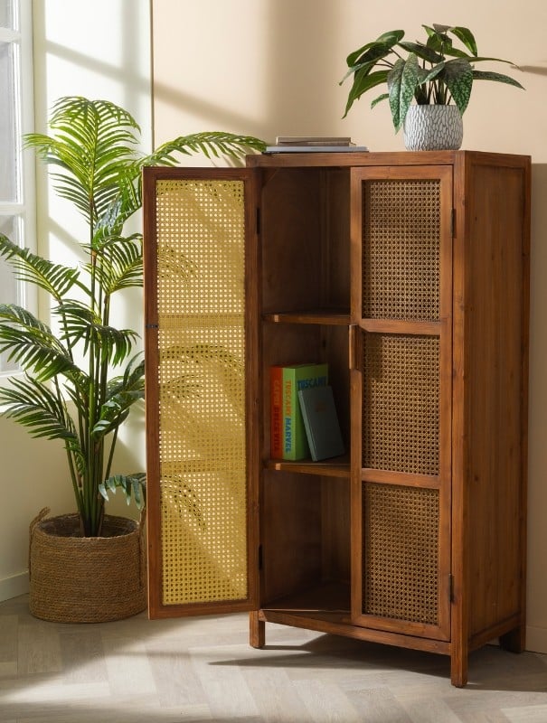 Deze kast is gemaakt van rotan en de voorkant van de deurtjes zijn gemaakt van webbing. Webbing is een speciale manier van rotan vlechten en bestaat sinds het begin van de twintigste eeuw, maar is nu helemaal terug van weggeweest! Het vlechtwerk zorgt voor een bohemian en retro look: helemaal van deze tijd dus.