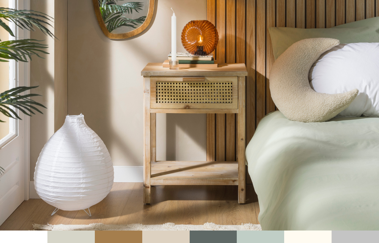 Verlichting is essentieel voor de juiste sfeer in je slaapkamer. Kies voor een hanglamp van gevlochten bamboe voor een warme uitstraling en gebruik een subtiele tafellamp als nachtlampje. Zo heb je zowel sfeer als praktisch licht bij de hand.